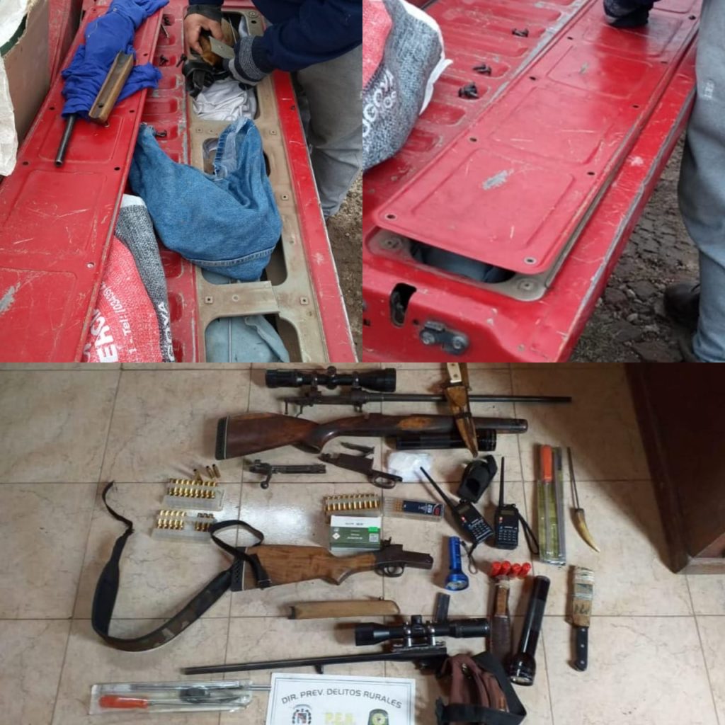 Para sorpresa de los uniformados que en un control rutinario de identificacion de vehiculos y personas, al detener la marcha de un vehiculo marca Ford Modelo Ranger, tipo pick- conducida por un ciudadano de 49 años de edad, acompañado de otro de 48 años de edad, ambos domiciliados en la ciudad de Nogoya, -los que a simple vista- no llevaban consigo armas de fuego, si una pieza abatida de chancho jabali, cartucheria varia, equipos de comunicacion, linternas varias, cuchillos, lo que hacia presumir que dicha actividad habia sido llevada a cabo con armas. Que adujeron habrian cazado con armas pero dichas armas eran de un familiar del campo, que no conforme con esto, personal policial realizo un control mas exhaustivo dado lo expuesto, y para sorpresa de estos se logro DIVISAR EN LA TAPA DE LA CAJA DEL RODADO, MAS PRECISAMENTE EN SU PARTE INTERNA, UN TRAPO, LO QUE RESULTO EXTRAÑO, QUE MAS EN DETALLE SE OBSERAN LAS ARMAS DE FUEGO ESCONDIDAS, siendo estas (02) Fusiles calibre 308, con miras telecospicas, presentando documentacion de las armas pero la actividad habia sido realizada en forma ilicita. Por tanto se realizo infraccion a la Ley Provincial de Caza Nro. 4841, ya que dicha actividad cinegética se encuentra vedada, se le secuestraron los elementos utilizados para la caza.