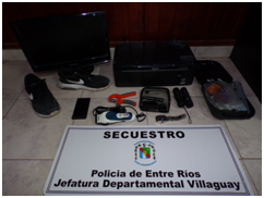 Se obtuvo como resultado positivo, procediendo al secuestro de un par de zapatillas deportivas de color negra de cuero marca Nike n°42, un monitor de computadora led de 19 pulgadas marca color negro “Samsung”, una impresora con scanner marca Epson color negra, un glucómetro marca Accu Chek Guide digital de color negro con su estuche y respectivas tiras reactivas, un elemento de rehabilitación de mano color naranja y gris. En otra de las fincas se obtuvo: Una maquina de cortar pelo con su respectivo estuche marca Wahl color blanca y azul con sus accesorios, un reloj pulsera marca Montreal, un larga vista Tasco, 12×25, una campera de paño color negro con capucha con parte interior a cuadros botones con pasadores color negro, una campera de tela de avión color azul y blanco con capucha, una máquina de cortar pelo color rojo y negro, un inflador de bicicleta de mano color negro, una mochila porta notebooks color negro, un parlante portátil a pila color azul con forma de auto, y una aspiradora portátil de auto con conexión de encendedor de vehículo.