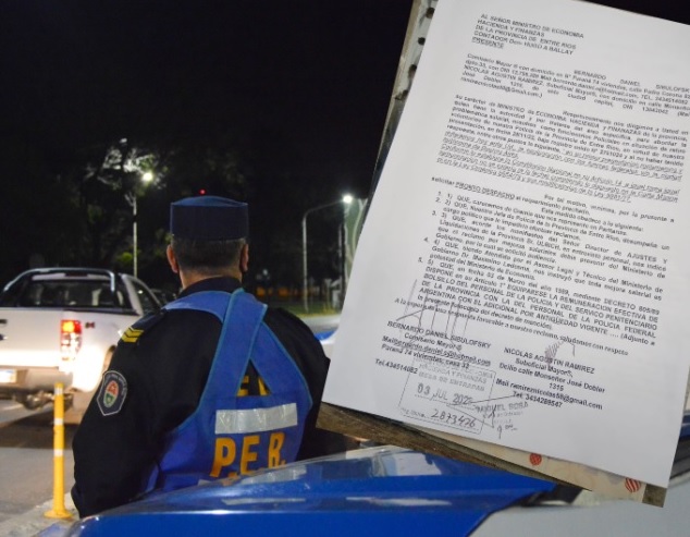 La nota expresa que los policías “carecemos de gremio que nos represente en la paritaria”, que el jefe de la Policía, Gustavo Maslein, “desempeña un cargo político que le impediría efectuar reclamos”. También explican que han efectuado planteo ante el área de Liquidaciones de Sueldos del Ministerio de Economía, área en la que le recomendaron reclamar por salarios ante el Ministerio de Gobierno.