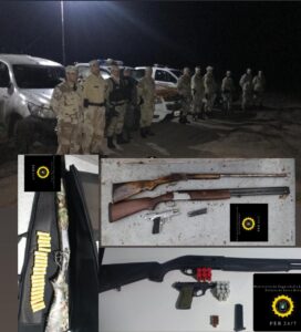 En el departamento Nogoyá, los brigadistas concurrieron ante un llamado de un productor ganadero en zona rural de Crucecitas 3ra. donde identificaron a cuatros masculinos en el interior del campo, practicando la caza de manera furtiva, quienes utilizaban para desarrollar la actividad una Carabina calibre 22, una Escopeta calibre 14 y otra Escopeta calibre 28, armas que no contaban con la documental respaldatoria, por lo que con conocimiento de la Fiscalía se procedió al formal secuestro de las mismas y se iniciaron las correspondientes actuaciones por Tenencia Ilegal de armas de fuego y Supuesta Infracción Ley Provincial de Caza 4841.