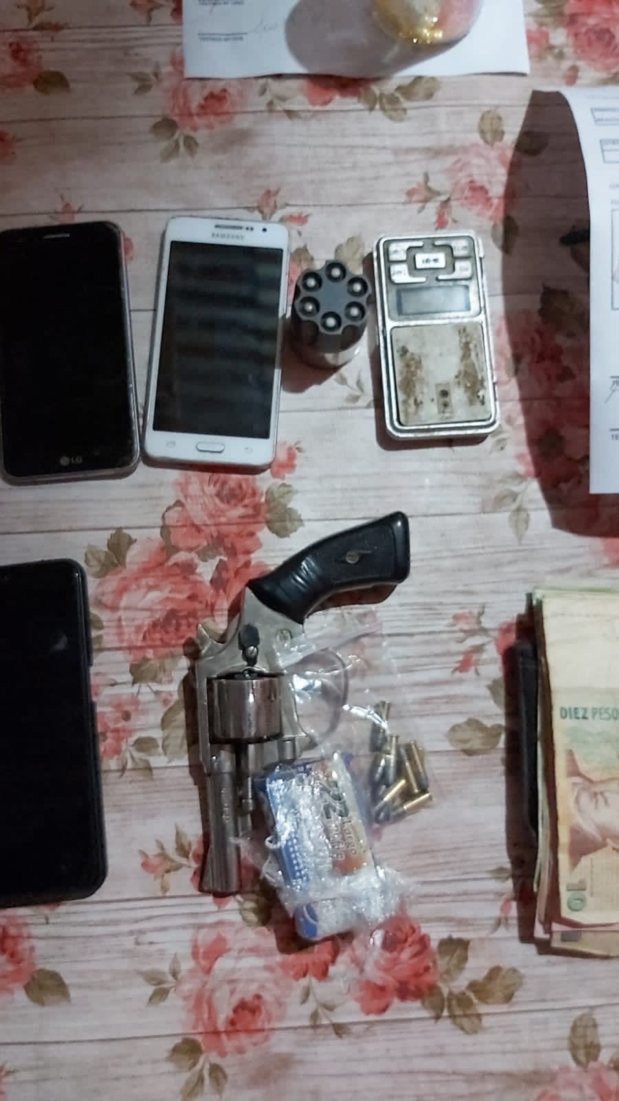 A raíz del mismo se realizaron dos allanamientos en distintos domicilios de esta ciudad; obteniendo los siguientes resultados: ocho (08) envoltorios de nylon conteniendo en su interior sustancia estupefaciente Clorhidrato de Cocaína, un (01) envoltorio de nylon, conteniendo en su interior sustancia estupefaciente Marihuana, dinero en efectivo más de treinta y ocho mil pesos, telefonía celular, grinder metálico (picador), una (01) balanza de precisión, elementos de electrónica, un automóvil Fiat Uno, una motocicleta Honda Storm y un arma (01)  arma de fuego, tipo revolver, calibre .22 largo, y treinta y nueve (39) cartuchos del mismo calibre.