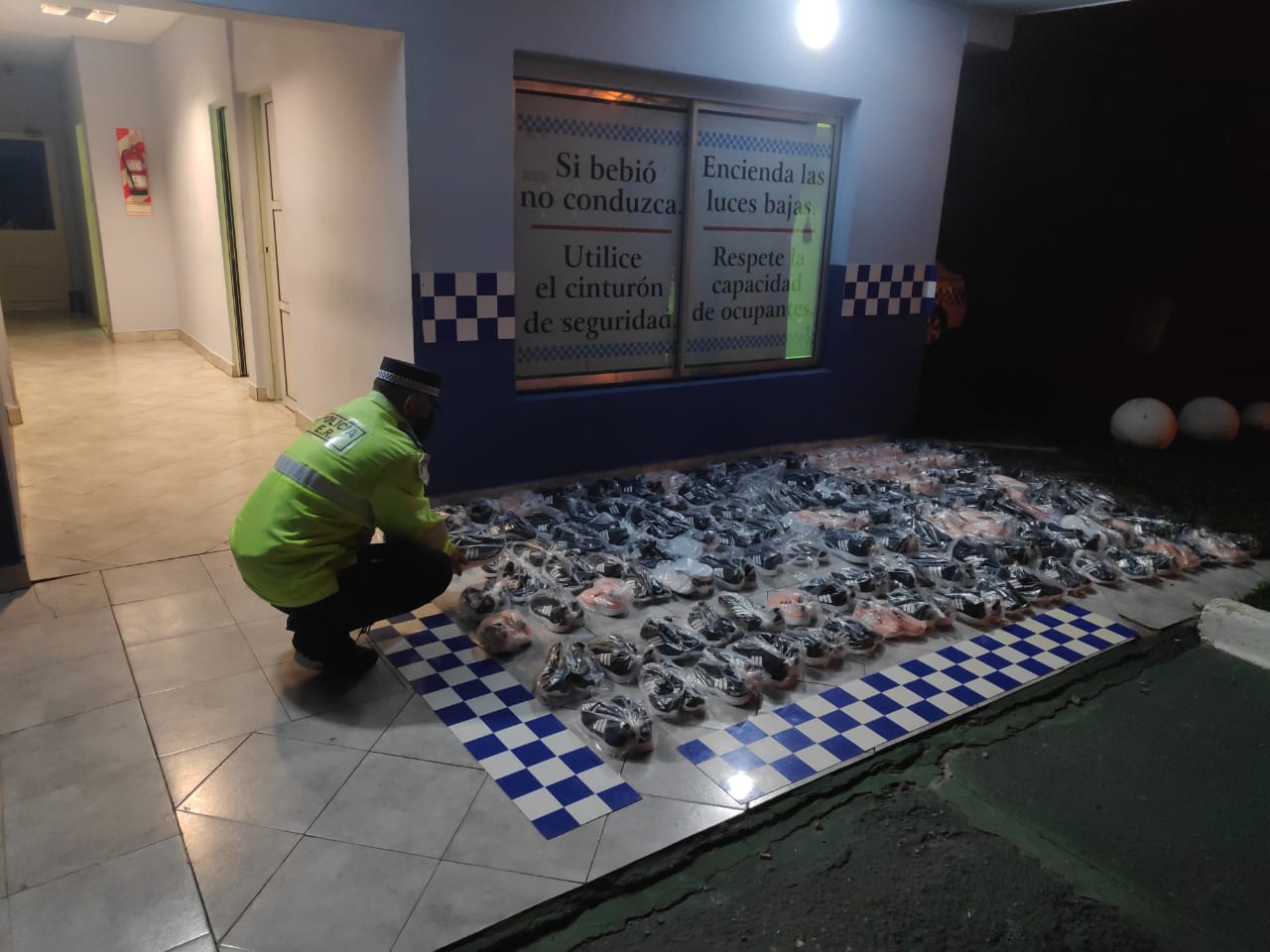 En los primeros minutos del día de hoy, cuando el personal policial destacado el puesto Caminero Paso Cerrito, dependiente de la Dirección de Prevención y Seguridad Vial de la Policía de la provincia de Entre Ríos, llevaba adelante controles sobre vehículos y personas en su inclaudicable labor de prevención pública en pos de la seguridad de la entrerriana toda, se detuvo la marcha de una pick up marca Volkswagen modelo Amarok que ingresaba a la provincia de Entre Ríos desde la hermana Corrientes. Una vez avanzado el control de la unidad se avanza en la visualización de la caja de carga del rodado hallándose en el lugar varios bultos en los cuales se hallaban 126 pares de zapatillas las mismas sin marca alguna, de talles y colores varios. Por esto, y al carecer el transporte de la debida documentación aduanera de la mercadería configurando esa faltante na clara infracción a la Ley Nacional 22.415, Código Aduanero se procedió al inmediato secuestro de la totalidad de la mercadería poniéndola a la disposición del citado ente nacional. Entanto el conductor quedo encarado de la infracción aduanera mencionada continuando su marcha.-