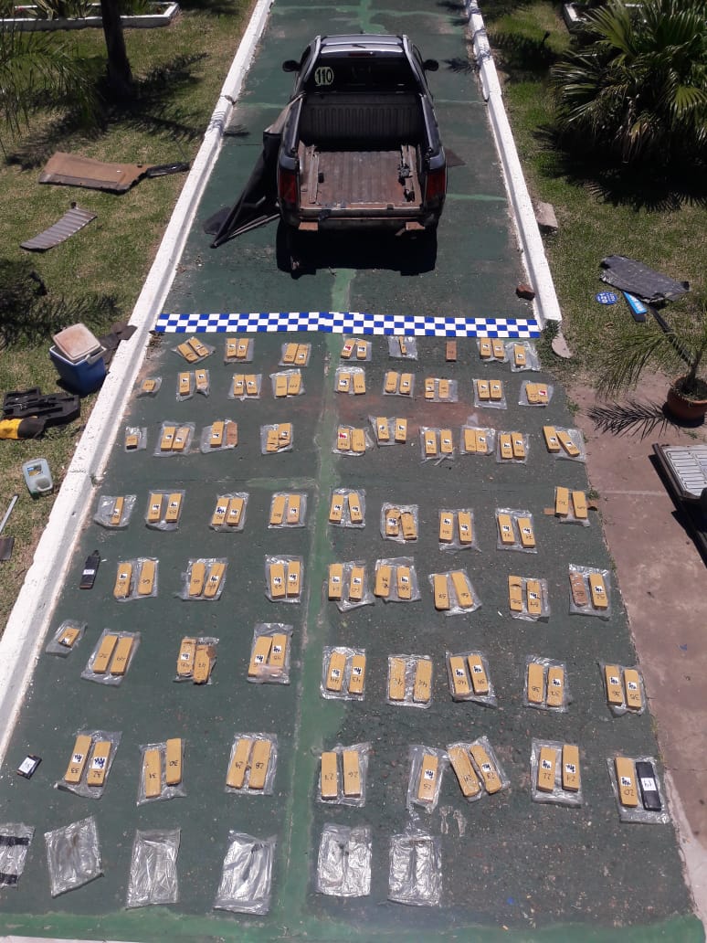 Que iniciado el control de la unidad, la documentación de rigor para circular y al realizar un control exhaustivo sobre el vehículo con can narcodetector y su guía natural el mismo adopta inmediatamente una conducta compatible con la presencia de estupefacientes detectandose ademas construcciones irregulares en la unidad. Ante esto es anoticiado de lo sucedido el Juzgado Federal de la ciudad de Concepción del Uruguay con competencia territorial y dándose intervención a la División Toxicología de la jefatura Departamental Federación se lleva adelante la requisa del utilitario hallandose la cantidad de 134 panes de cannabis sativa distribuidos en un doble fondo arrojando un peso total de más de 64 kg de peso con un valor de más de $ 40.000.000, estupefaciente que fue formalmente secuestrado junto con la unidad. El conductor que procedería de la provincia de Misiones fue incomunicado e inmediatamente detenido quedando a disposición de la justicia de excepción citada.