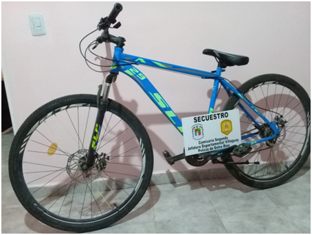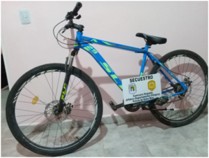 Arribados en la vivienda, y luego de entrevistarse con la propietaria de la finca, quien manifestó que su hijo menor de edad tenía una bicicleta de marca SLP rodado 29 de color celeste la cual no era de su propiedad; en consecuencia, y comunicado a la Fiscalía local en turno, se procede al formal secuestro del rodado siendo éste denunciado como sustraído días pasados, para que posteriormente sea entregado a su dueño.-