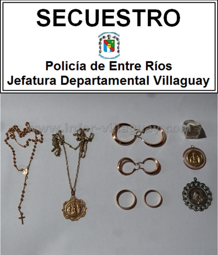 Personal de la División Investigaciones, luego de averiguaciones y tareas investigativas llevadas a cabo por el personal de robos y hurtos de esa repartición, procedieron a dar cumplimiento a un Oficio emanado por el Juzgado de Garantías a cargo del Dr. Julián C Vergara, que ordenaba el allanamiento y requisa domiciliaria de una vivienda de calle Vélez Sarsfield, en relación a una causa por el supuesto delito de robo. El personal policial procedió, mediante acta de estilo, al formal secuestro de dos pares de aros de oro, una medalla de oro, alianzas de oro, una cadena y medalla de oro y una medalla de plata. Se informo a las autoridades judiciales del resultado del procedimiento y se continúan con las actuaciones de rigor.