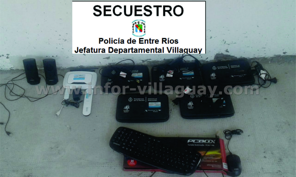 En el día de la fecha personal de la Comisaria de Mojones Sud Primera conjuntamente con funcionarios de la División Investigaciones, tras recabar información y tareas investigativas llevadas a cabo por personal policial antes mencionado, procedieron al formal secuestro de dos parlantes, un Router, un adaptador de WiFI, un teclado de PC, auriculares, un mouse, cinco Netbook marca EPSON, del programa primario digital, del Ministerio de Educación, con cuatro cargadores. Estos elementos habían sido sustraídos de la escuela N° 23 “Marta Bengoechea” durante el fin de semana, se encontraban escondidos en un campo vecino. Tomaron conocimiento autoridades tribunalicias y se continúan con las actuaciones de estilo.