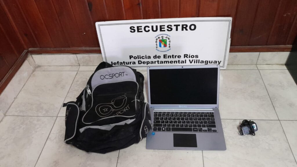 Siendo las 13:00 horas personal policial de la División Investigaciones luego de realizar arduas tareas investigativas pertinentes al hecho, llevó a cabo un allanamiento y registro domiciliario, obteniendo como resultado el secuestro de una notebook marca EXO y una mochila color negro con detalles en gris, a raíz del procedimiento se identificaron a los propietarios de la finca, quedando supeditados a la causa, continuando con las diligencias de rigor.-