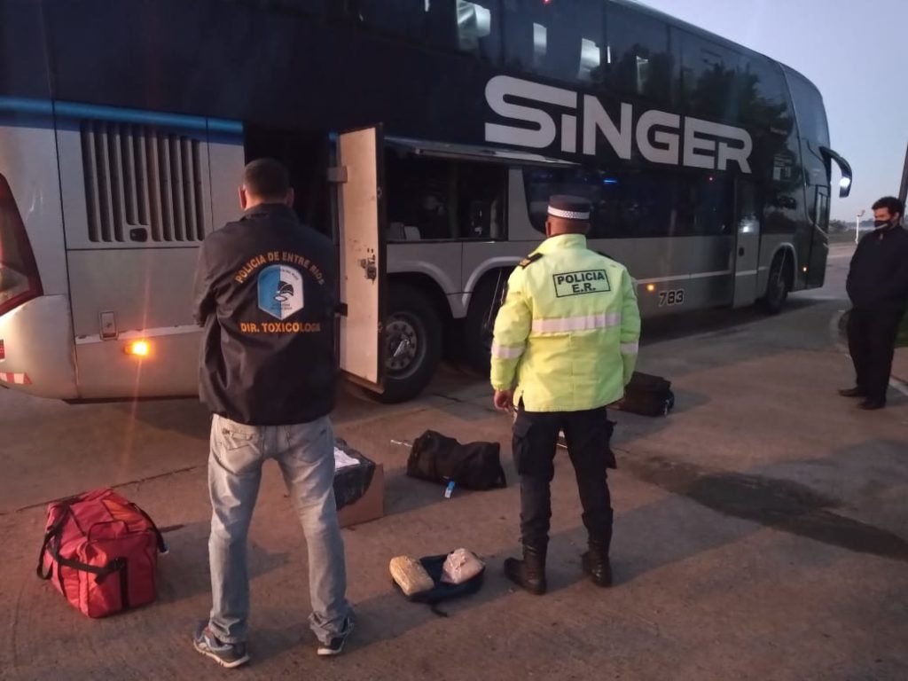 En la fecha, siendo aproximadamente las 03:20 Hs., mientras personal del Puesto Caminero San Jaime de la Dirección de Prevención y Seguridad Vial, realizaba control ininterrumpido sobre el tránsito vehicular, en un momento dado proceden a detener la marcha de ómnibus que ingresaba a la provincia, de la firma Singer, Interno 783, el mismo proveniente de la ciudad de Iguazu provincia de Misiones, con destino la provincia de Córdoba. Seguidamente se inspecciona el mismo, por lo que al llegar al piso superior del micro, más precisamente sobre la butaca 33, donde viajaba una persona de sexo masculino, mayor de edad, oriundo de la ciudad de Villaguay, el mismo comenzó a denotar un evidente estado de nerviosismo, motivo por el cual se le pasa a su mochila el can antinarcóticos “EVE”, quien toma la actitud propia ante la posible presencia de estupefacientes. Posteriormente y con el aval judicial del Juzgado Federal de Concepción del Uruguay, personal de Toxicología de Chajari, realizo la requisa correspondiente, detectando en el interior de la mochila aludida, la presencia de estupefacientes, más precisamente de Cannabis Sativa, envuelta en dos panes, cuyo peso arrojo un total de 860 gramos, lo cual fue incautado en presencia de testigos civiles. Como así también se procedió a la detención del masculino aludido.
