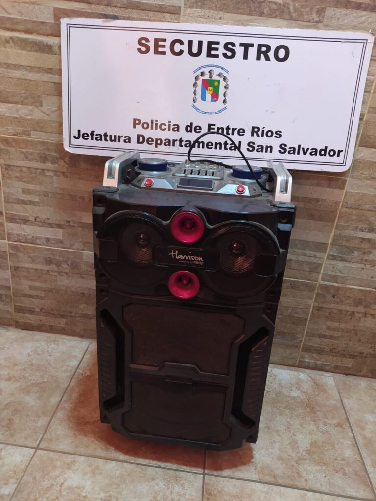 El procedimiento, se llevó a cabo a las 17:45 horas, en una finca ubicada en calle Vuelta de Obligado y Mario Jordán., logrando secuestrar un (01) parlante grande, con consola, entrada para pendrive, memoria, micrófono y conexión bluetooth, de color negro, dicho elemento interesaba en la causa.
