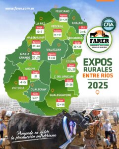 De este modo, un año más diversas localidades entrerrianas podrán disfrutar de las exposiciones con un despliegue que mostrará todo el abanico productivo asociado a la agroindustria, tecnología y servicios. Villaguay, Federal, Feliciano, Hasenkamp, La Paz, Gualeguaychú, María Grande, Colón, Gualeguay, Concordia, Concepción del Uruguay, Nogoyá, Chajarí y Victoria serán las encargadas durante 2025 de mostrar todo el potencial del campo entrerriano.