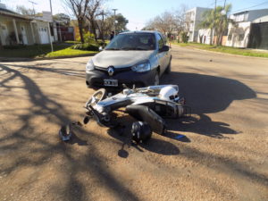 En horas de la mañana se produce un siniestro vial en Boulevard Manuel Savio y su intersección con calle Bernardino Rivadavia, en el que se vieron involucrados un vehículo Renault Clío conducido por una joven de 26 años de edad quien transitaba por el carril norte del Boulevard, en sentido Este-Oeste y una motocicleta Motomel C110 DLX, en la que se trasladaba un señor de 29 años de edad circulando por calle Rivadavia en sentido Sur-Norte. A raíz del siniestro el motociclista fue trasladado al Hospital Santa Rosa donde fue examinado por el médico policial quien determino lesiones de carácter graves por fractura de tobillo derecho. Intervino personal de Comisaria Primera informando a las autoridades judiciales de lo sucedido.-