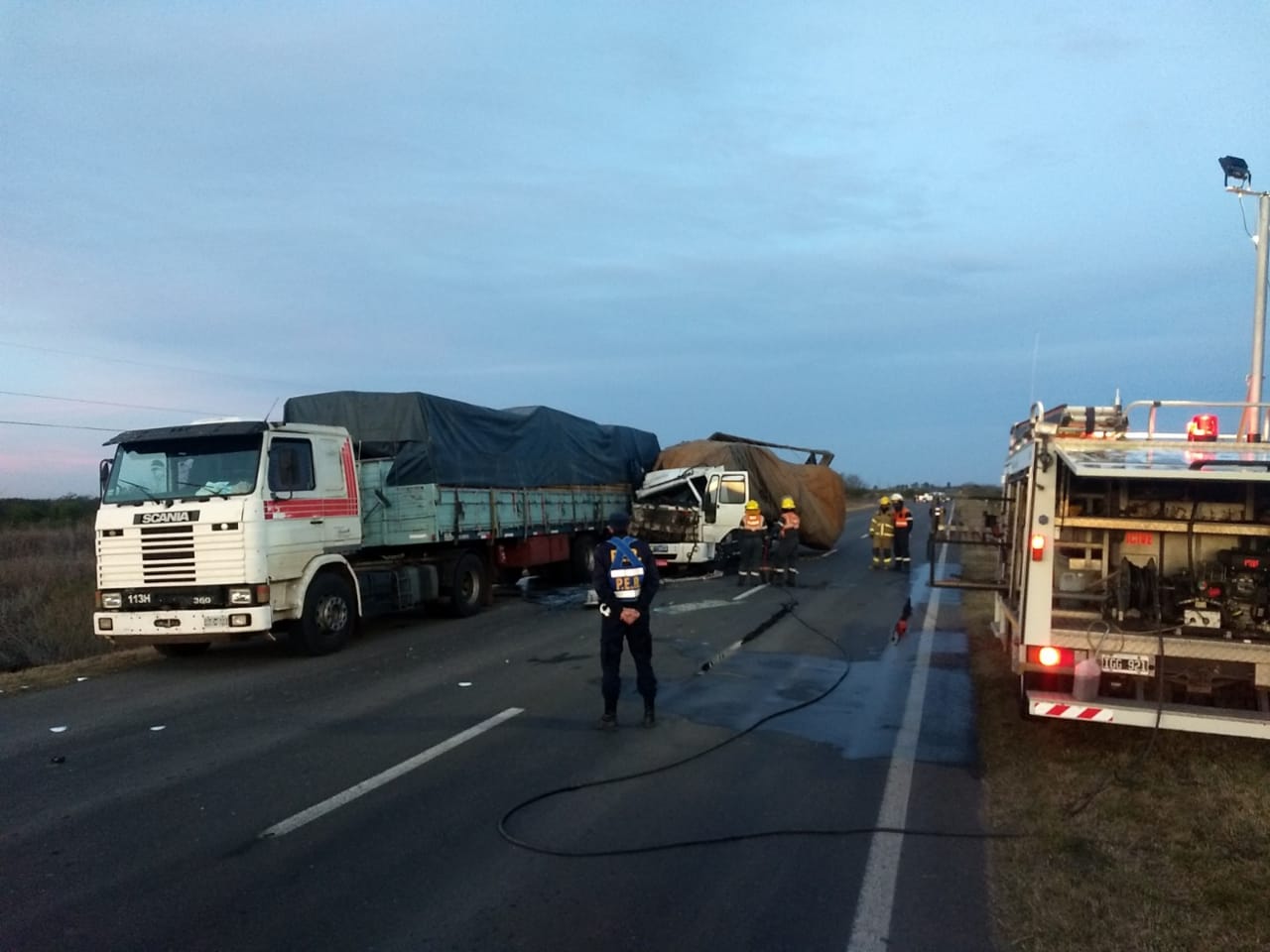 Por razones que se tratan de establecer colisionaron, un camión marca Ford cargo que transportaba motores diesel, donde se conducía un hombre de 34 años de edad, de nacionalidad Brasilero; y un camión, Scania R113h con acoplado, que se encontraba parado sobre la banquina, siendo este último conducido por un hombre de 62 años de edad oriundo de la provincia de Misiones, quien transportaba maderas.