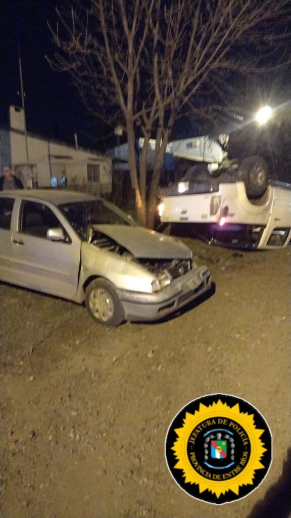 Debido al impacto el vehículo de mayor porte quedo volcado con sus rodados hacia arriba, no habiendo personas lesionadas, se da intervención a personal de la División Tránsito Municipal.