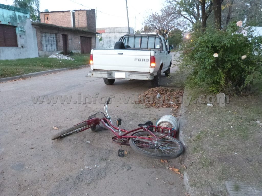 Personal policial de la Sección judiciales inicio actuaciones a raíz de un siniestro vial ocurrido en la tarde de ayer Miércoles 06 de Junio a las 17:45 aproximadamente en calles Esquiu y Córdoba, donde por razones que se tratan de establecer colisionaron una Pick Up marca Ford F 100 la cual se circulaba por calle Córdoba de oeste a este, y era conducida por un hombre de 58 años edad, y una bicicleta tipo playera de mujer, color rojo, que trasportaba una garrafa en el portaequipaje, la cual circulaba por calle Esquiú de norte a sur, y era conducida por otro hombre de 64 años edad. Como consecuencia del mismo el conductor del rodado de menor porte fue trasladado en ambulancia al Hospital Santa Rosa para su atención médica, una vez allí el médico de policía informó que presentaba lesiones de carácter leves. Trabajo en el lugar personal de comando radioeléctrico, fotógrafo y mecánico policial en turno.-