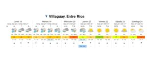 Finalmente el domingo se esperan temperaturas promedio en el orden de los 16 grados de mínima y los 30 grados de máxima. El cielo estará parcialmente nublado durante toda la jornada y el viento soplará del este rotando al sudeste.
