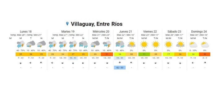 Para el miércoles se espera un nuevo aumento de las temperaturas promedio que se ubicarán entre los 23 y los 31 grados. Se prevén tormentas aisladas durante la madrugada y la mañana y tormentas aisladas durante la tarde. Los vientos predominarán del noreste rotando al noroeste.