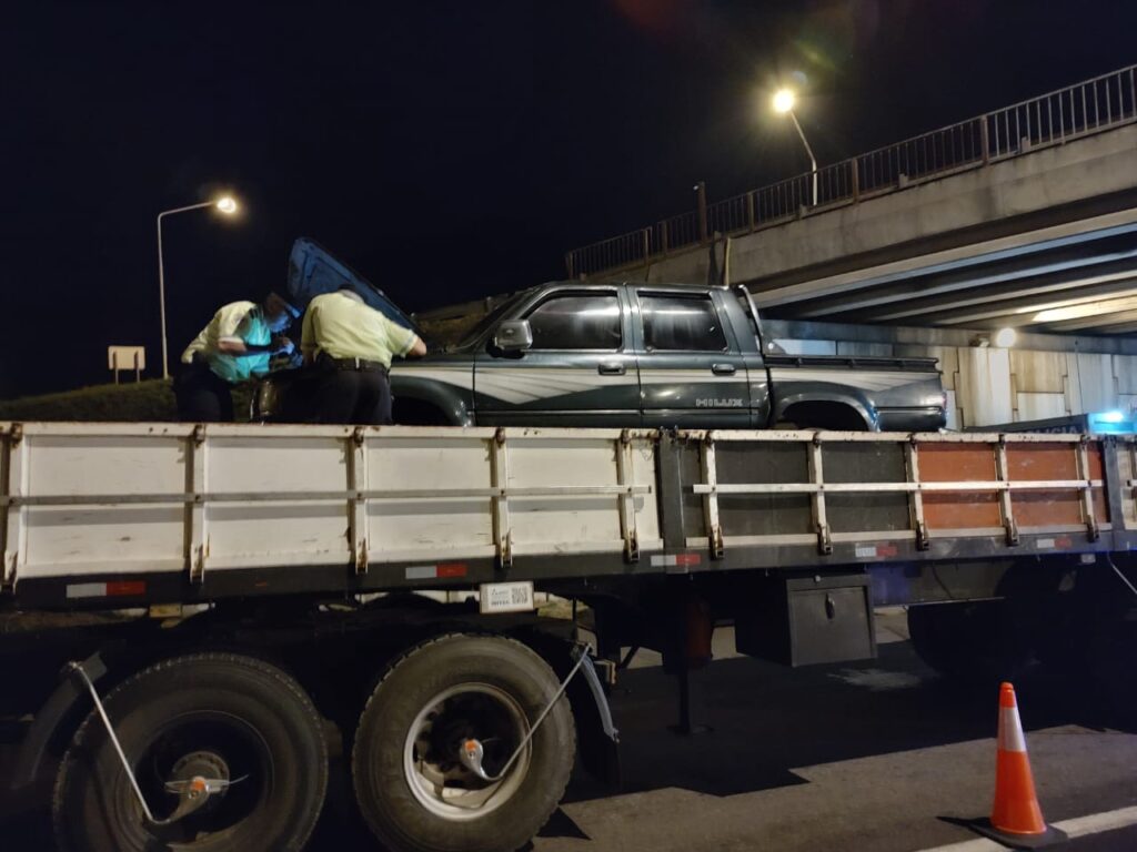 En la noche del jueves, el personal policial destacado del Puesto Caminero Gualeguaychú de esta Dirección Prevencion y Seguridad Vial, que se encontraba sobre Autovía Gervasio Artigas N°14 frente a dependencia, realizando de manera ininterrumpida inclaudicables operativos de control en el marco del Operativo Verano Seguro 2022/2023, logra detener la marcha de un camión marca VOLVO, modelo NL10 340 con dominio extranjero, en el cual se trasladaban dos hombres mayores, de nacionalidad argentina, domiciliados en la localidad de Paso de los Libres, provincia de Corrientes. Remolcando semirremolque marca FACCHINI, tambien con dominio extranjero, sobre el cual se transportaba una pick up marca TOYOTA, modelo Hilux con dominio colocado nacional.