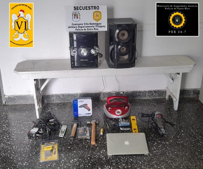 FECHA: Martes 13 de febrero de 20En relación al recupero de los elementos el día de ayer y continuando con la línea de investigación pertinente, en el día de hoy, martes 13 de febrero, personal de Comisaria de Villa Domínguez junto con personal del Grupo Especial Villaguay y Jefe de la División Operaciones y Seguridad se hicieron presentes en un domicilio de la localidad, donde un hombre de 40 años de edad hizo entrega voluntaria de (01) equipo de música marca Panasonic, (01) parlante marca Panasonic, (01) amoladora marca Skil 115 mm., (01) notebook marca Apple de 15″, de color gris claro con protector acrílico trasparente, (01) juego de siete llaves de boca y criquet marca Bulit, (01) reposera de caño blanco con tiras de color violeta, (01) formón marca Crossmaster de 5/8, (01) formón de 8 mm marca Crossmaster, (01) juego de llaves allen marca Crossmaster, (01) taladro atornillador marca Atma, (01) codificador de Directv con control remoto y cables de conexión, (01) martillo bolita de 800 gm., (01) masa de 800 gm; elementos los cuales fueron formalmente secuestrados.-