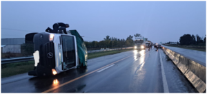 En el lugar, se observa una colisión entre un camión marca Mercedes Benz, conducido por un hombre de 65 años de edad, oriundo de la ciudad de Diamante; y un automóvil marca Toyota modelo Etios el cual era conducido por una mujer de 50 años de edad, con domicilio en la provincia de Corrientes. El camión circulaba en sentido Oeste- Este, como así también el automóvil, siendo éste último el que agarra un espejo de agua, en consecuencia, colisiona con la barrera de seguridad de hormigón y luego con la parte de atrás del camión, provocando el vuelco del rodado de mayor porte, siendo lo manifestado por ambos conductores, resultando sin lesiones.