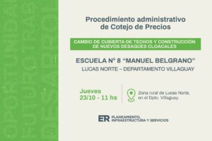 Con trabajos de reparación en la cubierta de techos y nuevos desagües cloacales, se intervendrá la escuela Nº 8 Manuel Belgrano de Lucas Norte, departamento Villaguay. La obra apunta a mejorar espacios para el desarrollo de actividades y beneficiará a la comunidad educativa rural.