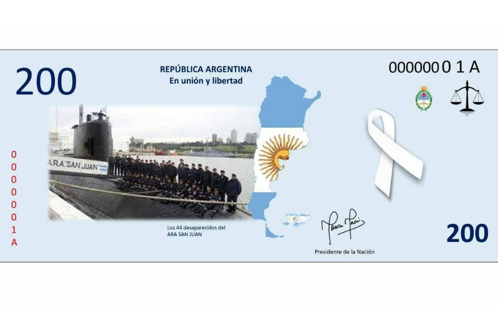 El billete con la imagen del submarino fue diseñado como parte de un trabajo práctico en la clase de Economía, por alumnas del 4to Año de la Escuela secundaria José Manuel Estrada, del pueblo santafesino de Bigand.