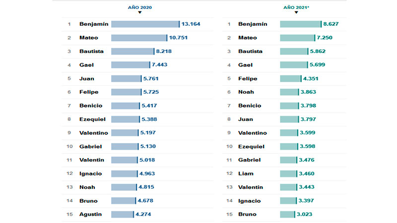 El tanto, en lo que va del 2021 y hasta el 16 de noviembre pasado, fueron 52.139 los bebés que nacieron y fueron nombrados con alguno de los siguientes 20 nombres: