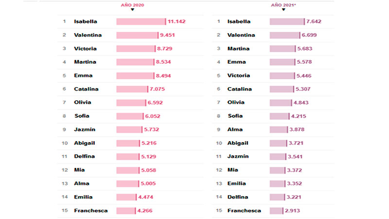 En el caso de las mujeres, fueron 75.050 las bebas nacidas en 2020 que llevan algunos de los siguientes nombres: