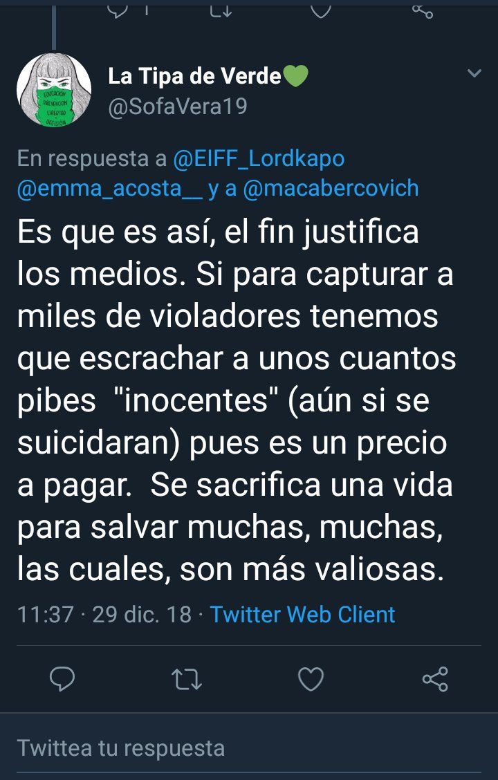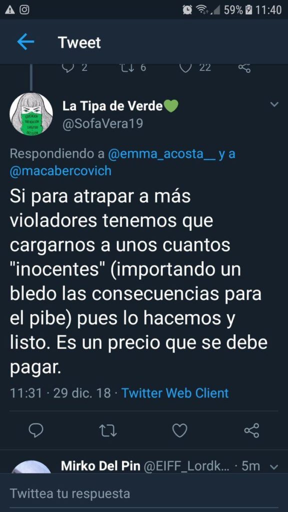 El conmocionante caso de Agustín Muñoz, el joven de 18 años que se suicidó en Bariloche tras ser acusado y escrachado en las redes de abuso sexual aunque se conociera que la denuncia era falsa, suma un nuevo y polémico capítulo. Es que ahora entre las tantas repercusiones en redes, la de la feminista @SofaVera19 no pasó de largo: festejó el suicidio diciendo que «el fin justifica los medios» y que se trataba de la muerte de un inocente que salvará miles de otras vidas. “Si para atrapar a más violadores tenemos que cargarnos a unos cuantos ‘inocentes’ (importando un bledo las consecuencias para el pibe) pues lo hacemos y listo. Es un precio que se debe pagar”, fue el primero de sus tuits.