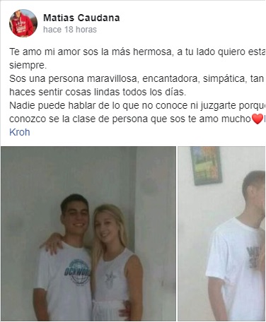 Matías, el hijo de Gonzalo Caudana, preso por narcotráfico ratificó su amor por Nahir Galarza, condenada a prisión perpetua por el crimen de su ex novio, Fernando Pastorizzo. «Te amo mi amor sos la más hermosa, a tu lado quiero estar y acompañarte siempre. Sos una persona maravillosa, encantadora, simpática, tan buenita que me haces sentir cosas lindas todos los días. Nadie puede hablar de lo que no conoce ni juzgarte porque yo que te conozco se la clase de persona que sos te amo mucho Nahir Galarza Kroh», escribió en sus redes sociales y etiquetó a Nahir con una serie de fotos de los dos.