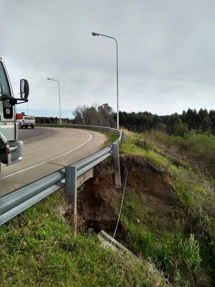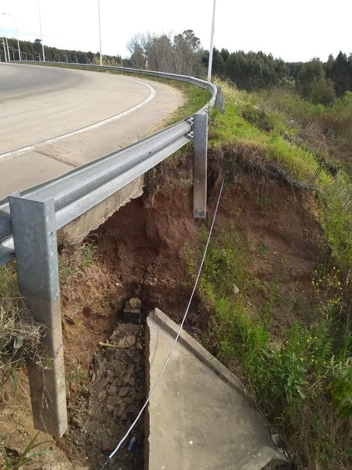 Rotonda de empalme hacia Villa Elisa Rta 130. Un cráter de varios metros de profundidad en la banquina de la misma. El guardarraíl está en el aire. Con la implicancia de que los vehiculos de gran porte y kilage puede pasar .uy cerca y provocar una desgracia.