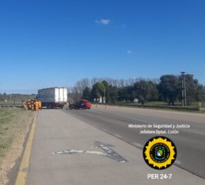 En horas de la tarde , personal policial dependiente de Jefatura Departamental Colón, intervino en un accidente vial ocurrido en inmediaciones de la Autovía Gervasio Artigas al Km 143, siniestro que involucró a un Camión marca Mercedes Benz, conducido por un masculino de 31 años de edad, acompañado de un ciudadano de 40 años de edad, ambos residentes en la ciudad de Villa Elisa, quienes al intentar ingresar al retorno para tomar por la Ruta, por motivos a determinar fueron colisionados en la parte trasera del rodado por un Automóvil marca Chevrolet Celta, el cual era guiado por una ciudadana de 35 años de edad, oriunda de la localidad de Gualeguaychú.