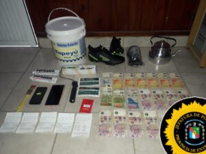 Como resultado de la diligencia, se obtuvo un resultado positivo, procediéndose al formal secuestro de los siguientes elementos de interés para la causa: Dos teléfonos celulares, un ticket del Banco Entre Ríos, dinero en efectivo, un balde de 10 litros de pintura, dos entonadores de pintura, dos sachets de entonadores de pintura, un rodillo, un pincel, un par de botines de fútbol, un par de canilleras, una pava de aluminio, elementos adquiridos presumiblemente con el dinero obtenido luego de cometer una estafa, como así también una tarjeta SIM (chip).