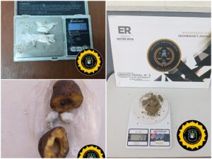 Como resultado de las requisas realizadas, se dio intervención al personal de la División de Drogas Peligrosas de esta Jefatura Departamental, que procedió al secuestro de los siguientes elementos: un envoltorio con cocaína con un peso de 1,4 gramos; tres envoltorios con cocaína (ocultos en el interior de una papa) con un peso total de 0,8 gramos; y un envoltorio con marihuana con un peso de 28 gramos.