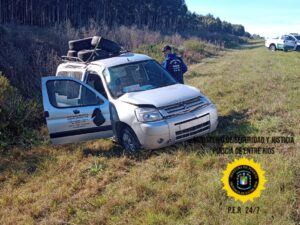 En horas de la mañana, personal de Comisaría Liebig, dependiente de la Jefatura Departamental Colón, intervino en un accidente de tránsito ocurrido en el kilómetro 179 de la Autovía Gervasio Artigas, donde, por causas que se tratan de establecer, una camioneta marca Citroën, modelo Berlingo, perteneciente a la Asociación Benéfica REMAR ARGENTINA, conducida por un hombre de 42 años de edad, acompañado por otros masculinos de 41, 33, 20 y 21 años respectivamente, todos residentes de la provincia del Chaco, perdió el control del rodado, produciéndose un despiste y posterior vuelco, finalizando sobre la banquina.