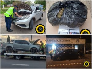 24/03/2025 – Puesto de Control Vial Bella Vista (Procedimiento de Narcomenudeo – Ley Provincial N° 10566): En la fecha, siendo las 16:00, realizando operativo de control, frente a la dependencia sobre el carril que sentido posee de circulación hacia el sur, el personal detiene la marcha de un vehículo Marca PEUGEOT, modelo 306, conducido por un masculino mayor de edad, domiciliado en Villa Elisa, Entre Ríos. Luego de controlar la documentación y el dominio del vehículo, surge como novedad la posible presencia de estupefacientes en el interior del rodado. Es por ello, que se informa a la Unidad Fiscal en turno y se da intervención al personal de la División Drogas Peligrosas de C. del Uruguay, encontrándose en el interior del vehículo una bolsa de nylon color negro, con una sustancia vegetal amarronada, pudiendo tratarse de cogollos de marihuana. Una vez realizado el narcotés, se pudo determinar fehacientemente que se trataría de cogollos de cannabis sativa (Marihuana) con un peso de más de doscientos gramos. Atento a este hallazgo la Unidad Fiscal, dispuso el secuestro de los estupefacientes y la correcta identificación del conductor, quedando a disposición de la causa que se investiga.