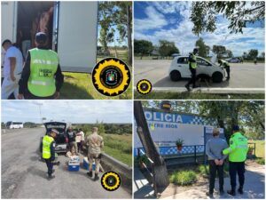 03/04/2025 – Puesto de Control Vial Brazo Largo (Secuestro de Estupefacientes): En la fecha, siendo las 12:20 horas y en circunstancias en las que el personal desarrollaba Operativo de Control Vehicular y de Personas, ubicados sobre la Ruta Nacional 12 y Ruta Provincial 16, se detiene la marcha de un vehículo que ingresa a la provincia, tratándose de un automóvil marca Chevrolet, modelo Onix HB, Patente Uruguaya de color azul, el cual era conducido por un hombre de 33 años de edad; el cual, iba acompañado de otro dos masculinos mayores de edad, 29 y 30 años de edad, respectivamente, todos de nacionalidad Uruguaya. Controlado la documentación y el dominio, no se encontró novedad de relevancia. Sin embargo, se podía anunciar un fuerte olor desde el interior del habitáculo, característico de la marihuana. Seguidamente se les consulta si trasportaban algún tipo de elementos o sustancias prohibidas a lo que manifiestan que sí, exhibiendo una bolsa tipo siploc con cogollos de marihuana y algunos cigarrillos de Cannabis Sativa armados artesanalmente, una pipa, dos picadores, y un recipiente metálico. Que ante esta novedad, se informó a la Unidad Fiscal de Gualeguaychú, quien dispuso el formal secuestro del material estupefaciente y la correcta identificación de los masculinos. En esta oportunidad también, se dio intervención al can detector de narcóticos, no encontrando otros elementos de interés para secuestrar. Se procedió con los Secuestros antes indicados y sin Detenciones.
