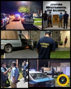En horas de la madrugada personal de Jefatura Departamental San Salvador, realizando tareas de prevención, observaron un vehículo realizando maniobras intempestivas en el radio urbano ocasionando con este accionar una colisión para con el frente de una vivienda de calle Eva Perón, provocando daños en su portón de garage. Inmediatamente son abordados por el personal policial, quienes constatan en el interior del vehículo dos ocupantes masculinos mayores de edad, los cuales no resultaron lesionados por el siniestro. Se dio intervención a Personal Municipal para realizar prueba de alcoholemia, dando resultado positivo para el conductor. Así mismo en el lugar intervino la División Drogas Peligrosas, ya que dentro del vehículo se constató la presencia de un envoltorio que luego del tes de rutina resulto ser positivo al reactivo de Cannabis Sativa con una totalidad de 7,5 gramos.