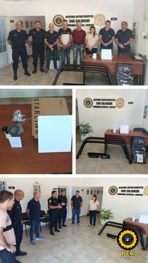 Asimismo, integrantes de la Comisión de Amigos de la Policía, Sres. Ramón Ferre, Darío Romero y Alberto Lorenzo, hicieron entrega de equipamiento de antena Starlink que será instalado en el móvil policial, con el objetivo de optimizar las tareas de prevención en zona rural y garantizar conectividad permanente durante el desarrollo de recorridas y operativos.