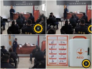 En consonancia con esta iniciativa, hacemos saber también a la comunidad que esta Jefatura cuenta desde el día de hoy con un desfibrilador portátil el cual se encuentra ubicado en la Oficina de Guardia apresto para su uso en caso de ser necesario no solo por personal policial sino por cualquier persona que lo necesite en las inmediaciones. Este costoso instrumento médico ha sido adquirido a través del fondo de ayuda al personal policial a instancias del Sr. Jefe de Policia de la Provincia Crio. Gral. Lic. D. Claudio Omar González y del administrador de dichos fondos, Sr. Sub Jefe de Policía de la Provincia Crio. Gral. Lic. D. Juan Marcelo Clausich.