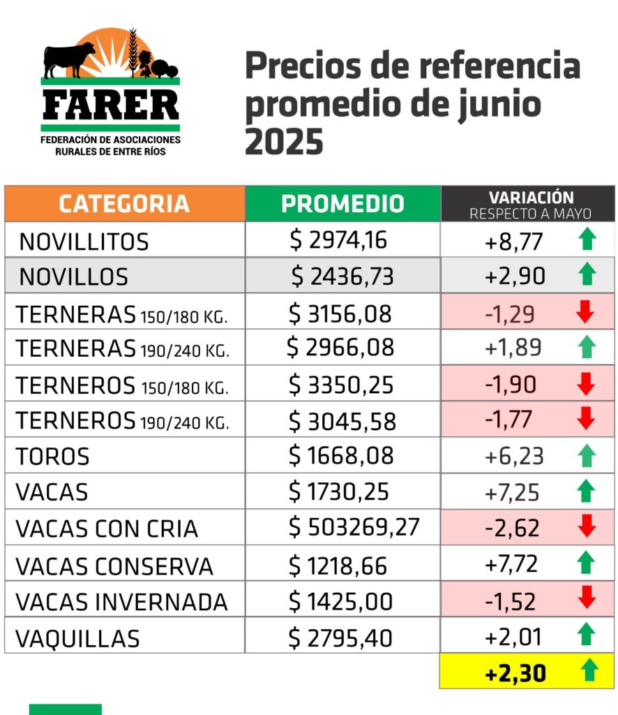 La Federación de Asociaciones Rurales de Entre Ríos (FARER) hizo público este martes la pizarra de los precios promedios de la hacienda en pie surgidos de los distintos remates llevados a cabo durante junio en las instalaciones de las sociedades rurales de nuestra provincia.
