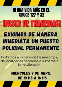 “¡Basta de tragedias! Exigimos de manera inmediata un puesto policial permanente. Invitamos a vecinos de Hasenkamp y localidades cercanas a sumarse a la movilización”, indica uno de los flyer que comenzaron a circular en redes sociales estos días.