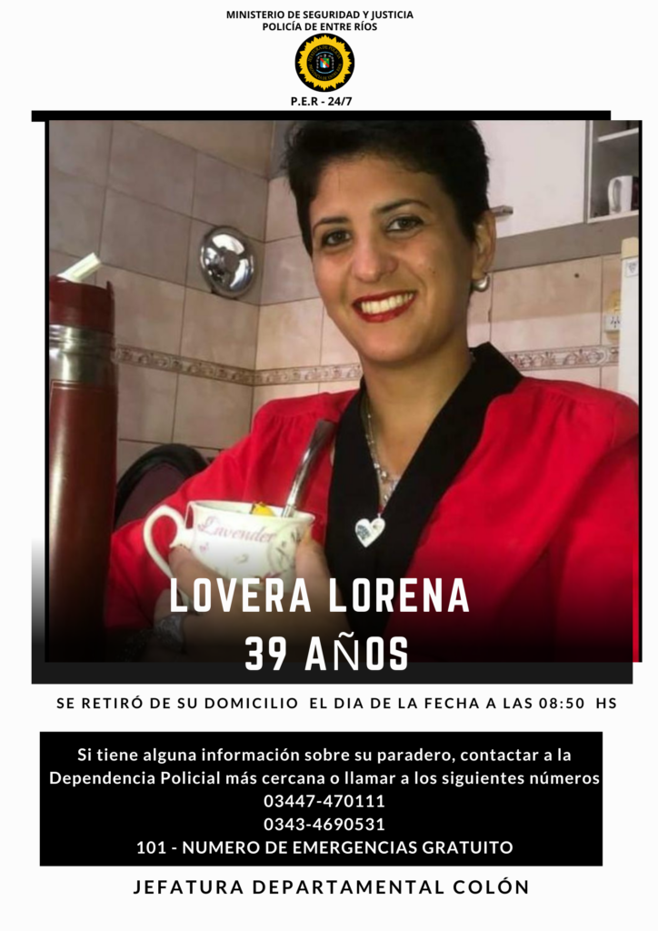La Policía de Policía de Entre Ríos solicita la colaboración de la comunidad en el pedido de localización de la señora LOVERA LORENA, de 39 años de edad, domiciliada en calles Cabildo 2086 de la ciudad de San José, la misma se ausentó de su hogar aproximadamente a las 08:50 horas de la fecha, y desde entonces no ha sido posible ubicarla.