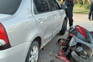 En horas de la tarde, personal policial dependiente de Jefatura Departamental Colón intervino en un siniestro vial ocurrido en intersección de Av. San Martín y H. Bachini, donde por causas que se tratan de establecer colisionaron un motovehículo marca Honda Scooter 125 cc, conducido por un ciudadano de 44 años, que circulaba por la primera arteria en sentido Este a Oeste, y un automóvil marca Toyota Etios, guiado por una mujer de 30 años, que lo hacía por la misma arteria en sentido contrario.