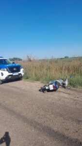 A la hora 07:40 se recepciona un llamado al 101 informando de un siniestro vial en el camino denominado a Yerua, concurriendo personal policial y entrevistandose con una señora, de 39 años de edad, con domicilio en Estacion Yerua Concordia, la cual manifiesta que minutos antes circulaba en su Motovehiculo Corven 110 cc, desde su domicilio a la localidad de General Campos, y que motivo de derrapar en una huella se cae del rodado teniendo un fuerte dolor en su pierna derecha. Es trasladada por una ambulancia al Hospital Gral Campos y luego de su atención el galeno informa que presentaría lesiones leves.