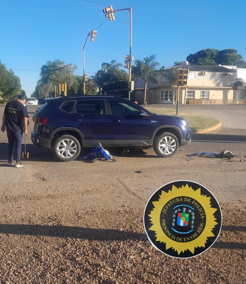 En horas de la tarde de la fecha, por causas que se tratan de establecer, un vehículo marca Volkswagen modelo Taos conducido por un masculino de 73 años de edad, en momentos que circulaba por Bv. Concordia al llegar a su intersección con Av. Entre Ríos de esta ciudad, colisiona con una motocicleta marca Guerrero Trip al mando de una femenina mayor de edad. Como consecuencia de lo ocurrido la conductora del motovehículo, fue trasladada en ambulancia hacia el nosocomio local debido a las lesiones que presentaba a determinar. Intervino personal del Gabinete Criminalístico, quienes realizaron el relevamiento planimétrico del lugar.-
