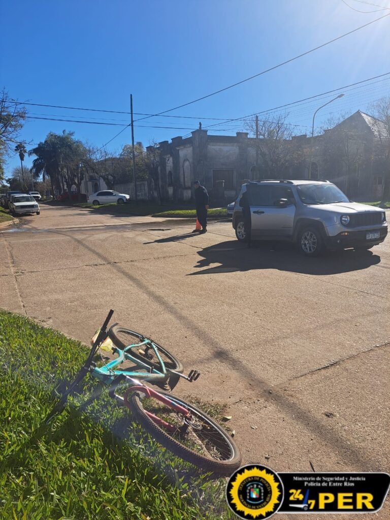 En horas de la tarde del día de la fecha, personal policial de esta Jefatura Departamental, se hace presente en Francisco Ramírez y Tomas de Rocamora donde una camioneta marca Jeep, conducida por una persona mayor de edad, quien la que circulaba por calle Tomas de Rocamora, que al llegar a la intersección de calle Francisco Ramírez, colisiona con una bicicleta la cual se trasladaba una mujer mayor de edad, la persona que conducía el rodado de menor porte fue trasladada preventivamente en ambulancia hacia el nosocomio local, se le da intervención al Galeno policial en turno que determino que el carácter de las lesiones serian leves, no hubo daños materiales, se realizaron las diligencias de rigor.-