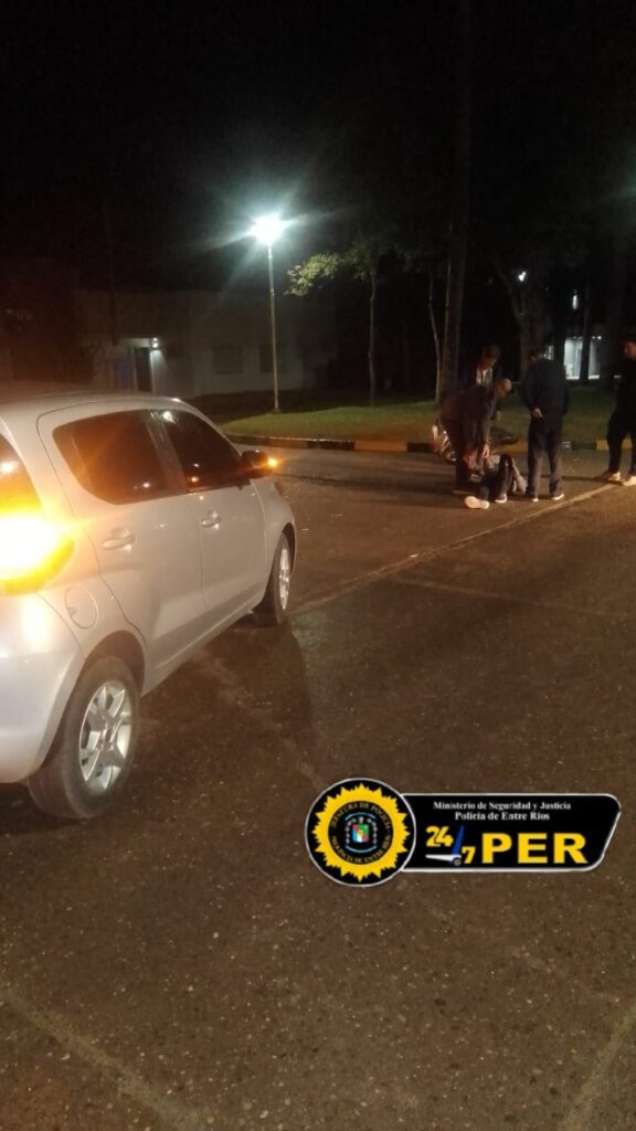 En horas de la noches, se toma conocimiento en el Comando Radioelectrico, por un llamado telefónico, donde alertaban de un accidente de transito ocurrido en Avda. Los Rusos y Urquiza, con una persona lesionada, por tal motivo es que se dio intervención al Hospital local y se comisiono un móvil al lugar, observándose una colisión, en la cual un automóvil Fiat Mobi, que era conducido por una vecina de esta ciudad, circulando por Av. Los Rusos en sentido Sur y al intentar querer doblar hacia Urquiza es colisionado por un moticiclista que lo quería rebasar en ese momento. El conductor del vehiculo de menor porte sufre lesiones y es trasladado al Hospital local, donde luego de ser examinado presenta lesiones leves. Se continúan con las tareas de rigor.-