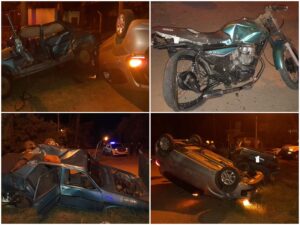 Por causas que se tratan de establecer, se vieron involucrados tres vehículos: una motocicleta, un automóvil Renault 12 y un automóvil Fiat Mobi.