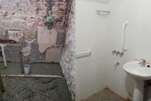 Entre las principales acciones se incluyen la instalación del sistema de desagües cloacales de los baños, la renovación de la provisión de agua fría y caliente, la ejecución de contrapisos, carpetas y colocación de pisos, junto con nuevos revestimientos y artefactos sanitarios. Además, se realizan reparaciones de revoques, trabajos de pintura en sectores puntuales, la renovación de la instalación eléctrica y mejoras en la cubierta de techos, así como la terminación del muro medianero.