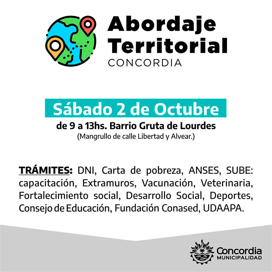 Ayer viernes, la cuenta oficial de la Municipalidad de Concordia en la red social Facebook anunció un operativo de “abordaje territorial”, que se llevará a cabo hoy sábado por la mañana, en el Barrio Gruta de Lourdes.
